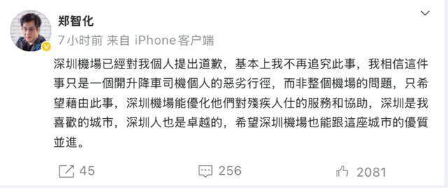 随后,郑智化回应称,深圳机场已经对他个人提出道歉,他不再追究此事,相信这件事只是一个开升降车司机个人的恶劣行径,而非整个机场的问题,只希望借由此事,深圳机场能优化对残疾人士的服务和协助。