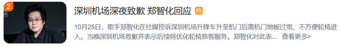 10月25日,歌手郑智化在微博发文表示,自己在深圳机场乘坐航班的时候,升降车升至机门后离机门地板有25厘米距离,导致其轮椅无法推入飞机。而操纵升降车的司机不愿把升降板提高,冷眼看着他“连滚带爬”进飞机。此事在网络上引起关注和热议。